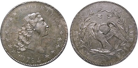 В 2010 году Президент торговцев раритетными монетами Стивен Контурзи, продал на аукционе серебряный доллар 1794 года за 7.850.000 $ для американской компании "Rare Coin Wholesalers". Данная продажа является мировым рекордом среди продаж раритетных монет. Всего в 1794 году было изготовлено 2 тыс. таких монет, 242 из которых сразу уничтожили из-за плохого качества, остальные 1758 были подарены разным официальным лицам США. Как видно на фото, серебряный доллар представляет из себя круглую монету в центе которой с одной стороны находится изображение девушки с распущенными волосами, что символизирует Свободу. Над бюстом расположена надпись "LIBERTY" и 15 звезд по бокам, что символизировало количество штатов в США на момент выпуска монеты. С другой стороны находится изображение белоголового орлана, который является национальным символом США. Также полукругом на краю монеты находится надпись "UNITED STATES OF AMERICA".
